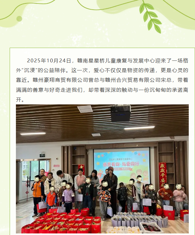 2025年10月22日,在赣南星星桥儿童康复与发展中心里,上演了一场不寻常的、充满面包香与笑声的温暖聚会。大课间的铃声刚刚响起,我们星星桥的孩子们就发现,熟悉的教室里多了一些亲切的“新朋友”。他们是来自赣州辰睿网络有限公司和澳洲味道的爱心志愿者们。今天,他们不是为了远道而来的参观,而是作为“一日厨师”和“贴...